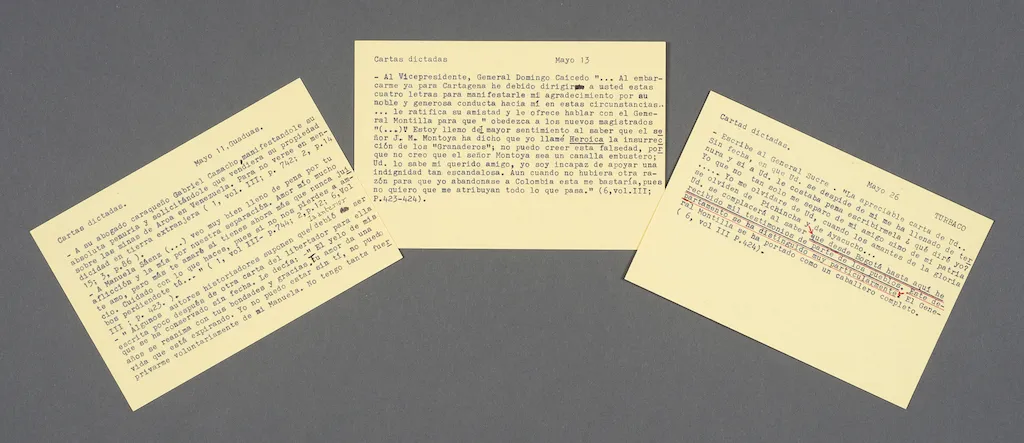 García Márquez no solo leyó estos materiales y subrayó buena parte de ellos, sino que, tal vez por primera vez en su carrera, realizó tarjetas bibliográficas para orientarse en la consulta de datos y episodios regados en este extenso cuerpo documental, una herramienta que los historiadores han usado por décadas. Estas tarjetas también hacen parte del archivo de Gabriel García Márquez en el Harry Ransom Center y muchas de ellas se pueden consultar en línea.