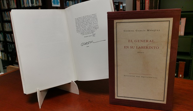 Soy periodista en la Universidad del Norte, haciendo una nota de prensa sobre curiosidades de nuestra Biblioteca, me topé con que tienen el ejemplar número 14 de El General en su laberinto, autografiado por el puño y letra de nuestro nobel de literatura. Y hace parte de una colección limitada de ejemplares impresos.